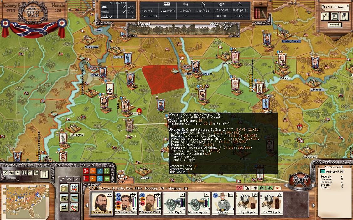 Looking at TN you’ll see that a couple Union brigades have moved to cut the Pulaski Nashville RR. Nashville has 443 GS, so this doesn’t really matter now. A division led by Buckner will try to capture the rest of half of the Union force in TN. Hampton’s former division still goes to Atlanta. Kershaw, who has healed after Grant’s attack nearly killed him, heads to Atlanta to form a division there in a couple turns.
