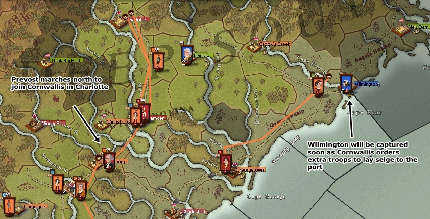 Cornwallis and Prevost will jopin forces and capture the towns of Wilmington and Hillsboro while using irregular forces to subdue the local rebels
