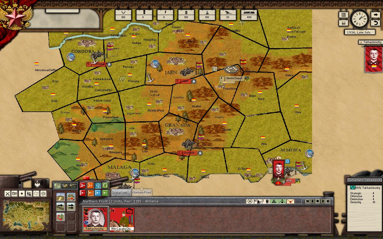 My idea is to begin with a couple of troops. The Nacionalist will have a stack in Sevilla and will move towards enemy defended regions trying to achieve Victory Conditions. In this way i will test the part of creating new Factions, new units, and testing the map also.