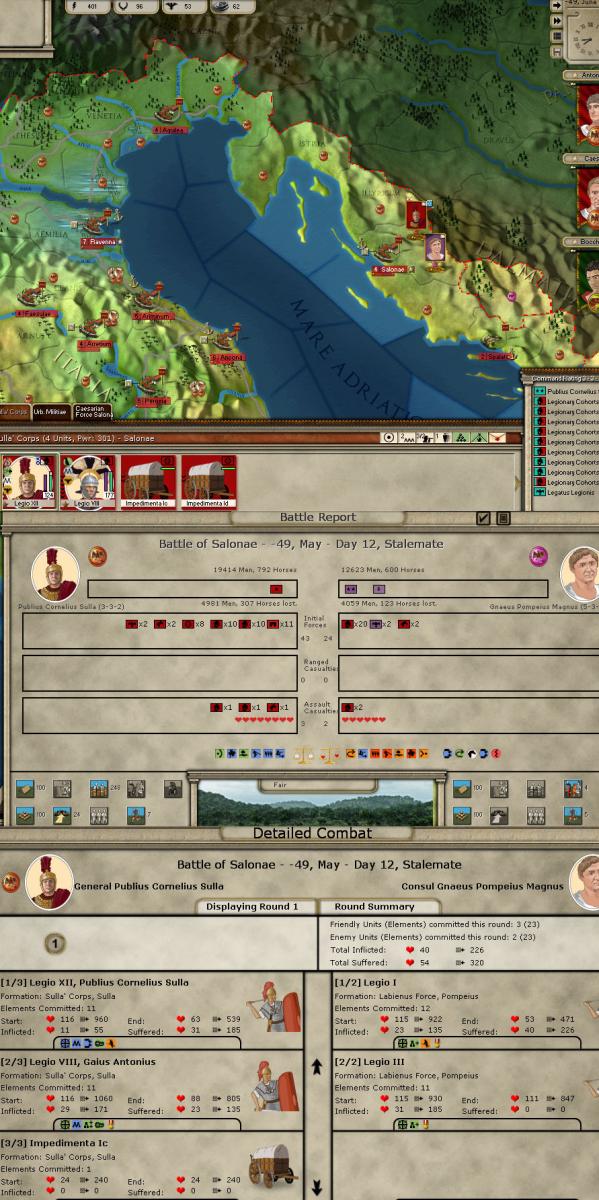 2 new generals a two star and a one star appear in Salonae this turn. They are ordered to Rome to join the defending stack there. For now I have no troops that need them, so they’ll be assigned units as soon as I can afford some new production.