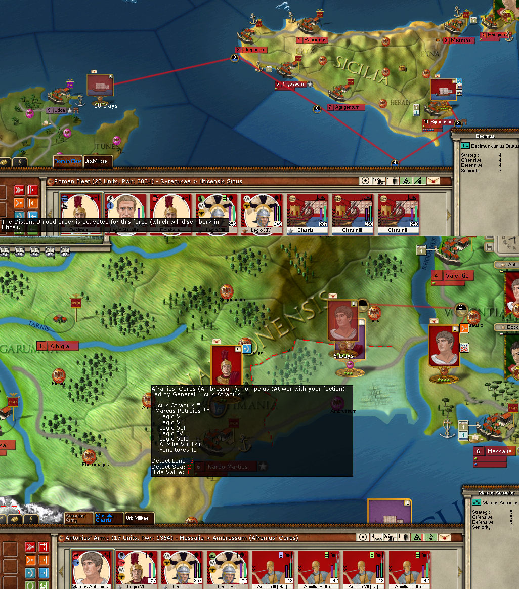 So as soon as the destruction of the Pompeian legions is complete, Hispania (I assume that’s where the legions came from) should be ripe for the picking. Antonius’ 3 legions and the 4 other legions in southern Gaul commanded by Curio and Fabius should make short work of it.