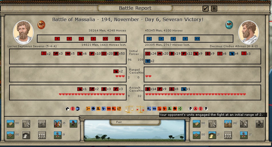 If you check the 3rd screenshot (1 st round detailed battle), at top right you see i inflicted 143 hits but this number is definitevely greater than the total ranged casualties that my opponend took (check 1st or 2nd screenshot, i.e. global battle report). Also, if the global report says that i started at range 1 and my enemy at range 2, how i can succeded to hit him and slain him only with ranged fire ?