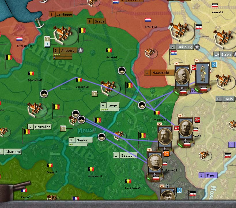 The 1st Army should go through Maastricht and bypass Liege/Namur to the north, heading straight for Brussels. They will arrive at Brussels a little earlier than historically but not by much. I highly suggest keeping an eye on where the various parts of 1st Army will end up after they finish moving on Turn 2, as the BEF is likely to be around the Lille/Mons area, and they will wreck havoc on the 1st Army if they get the chance to attack the individual corps piecemeal. The big thing is making sure Kluck and his reserves are close to the front-line corps in 1st Army (Linsengen in particular has a tendency of getting ahead of the main force). The BEF usually ultimately decides whether Germany's advance is stopped or not, so be VERY wary of them in Late August and Early September turns!