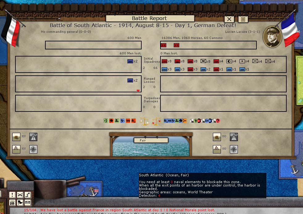 Germans start out with a fair number of cruisers spread out throughout the map, mostly in the Atlantic and Pacific Ocean areas (these are along the right side of the mini-map, indicated with a box with P for the Pacific areas and A for the Atlantic areas). Each turn they stay on the high seas, they cause some damage to France's money, war supply, and a small hit to VP. None of these are huge, but enough to make tracking them down worthwhile. The best approach is getting your own groups of cruisers and destroyers together and going "hunting". Put them on offensive operations in areas you suspect enemy cruisers and gradually you'll weed them out. I suggest making your patrols around 400-600 CP strong, otherwise they may not be strong enough to take out Graf Spee should they run afoul of him...