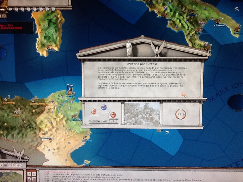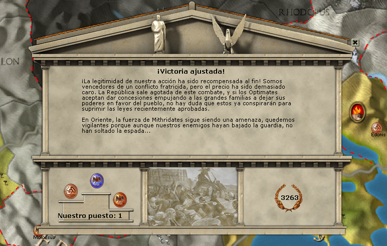 ferrenava wrote:Yo estoy jugando con Mario en esta campaña, me quedan unos 15 turnos, Hispania es mia, tambien Africa e Italia y estoy luchando ya contra el Ponto, Sila solo tiene dos legiones mermadas ya y anda escondiendose, creo que sera victoria para mi por puntos.