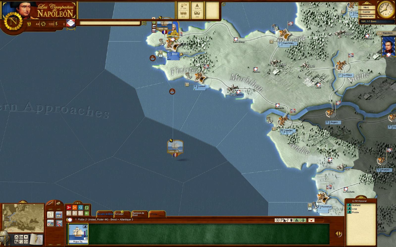 En cuanto a objetivos y estrategias, la intención es llegar primero con la flota reunida al Canal de la Mancha (a ser posible con el mínimo de bajas), y sólo entonces intentar el paso de la Grand Armée con la flotilla de invasión desde Boulogne. Esta será digamos la primera parte de la partida, donde la acción será eminentemente naval. El segundo objetivo, si consigo el primero, será conquistar con los cuerpos de ejército todas las regiones de las islas británicas que se puedan, intentado mantener a raya al mismo tiempo a la Royal Navy.