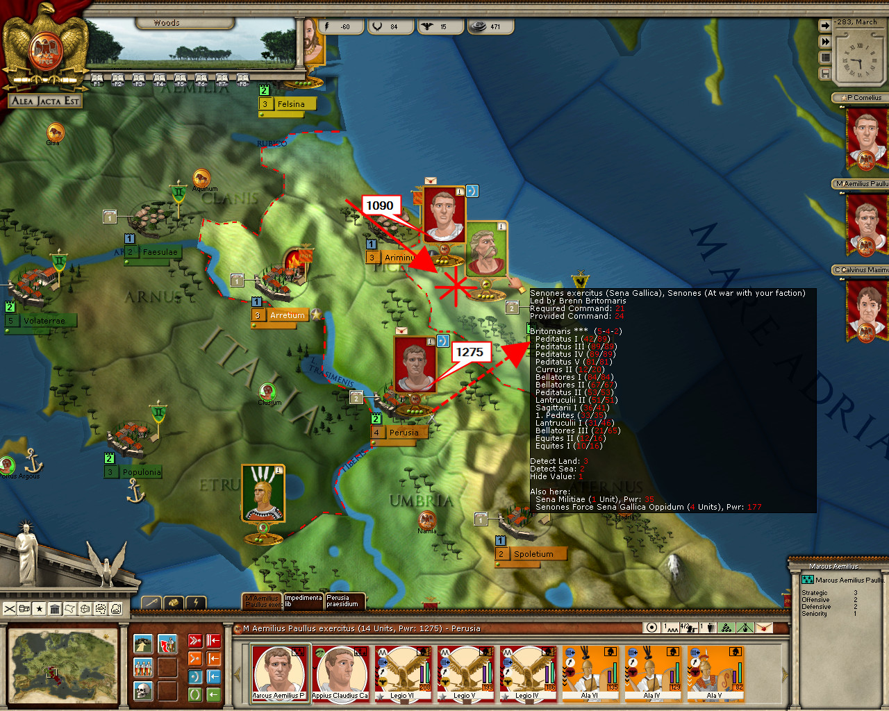 Arretium (controlled by Rome, right on the border with the enemy): 5