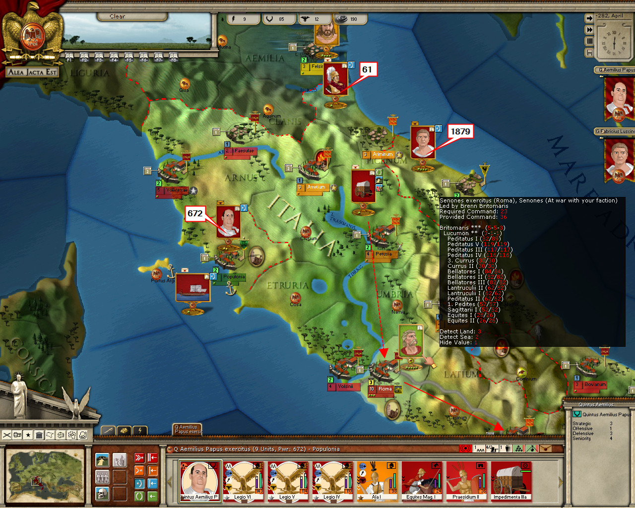 So, on to this turn. Tucca’s army is locked for a turn, and I certainly don’t want to divide my army up within marching distance of Britomaris combined mob. Plus, Denter is inactive this turn on top of that, so, the prudent move for me this turn is no move at all. We’ll just sit in Rome for a turn and see what the barbarians do. I expect he’ll either move on Arretium (most likely, as it is an objective and he can storm it, as it’s only a level 1 fort) or Perusia. I’ve marked these speculative Gallic moves with dotted green arrows on the map.