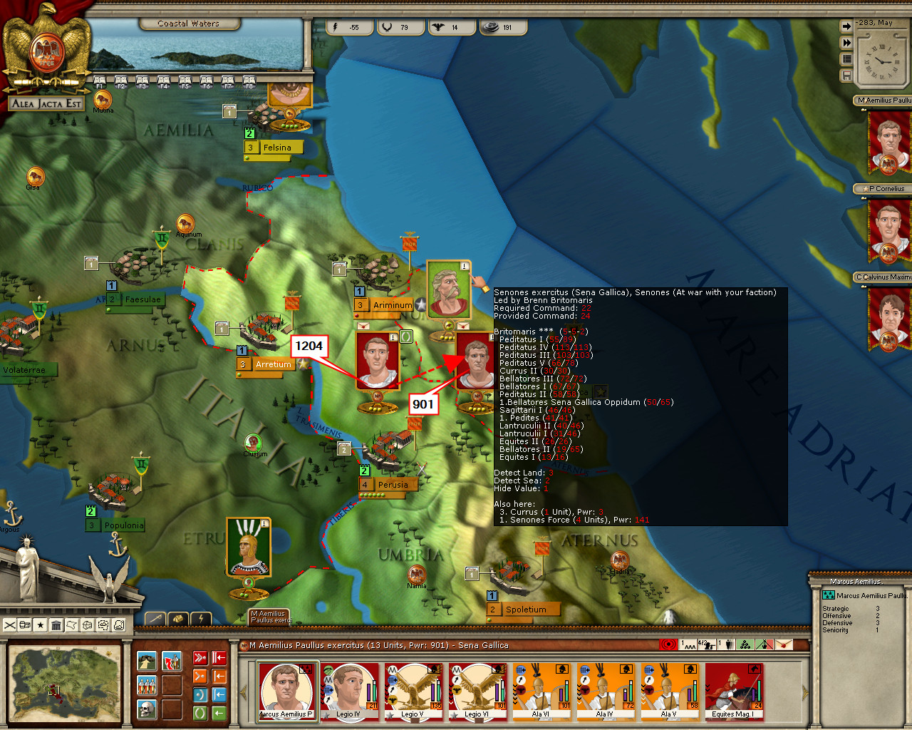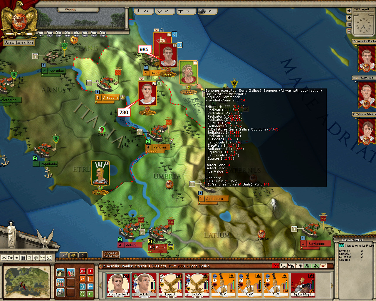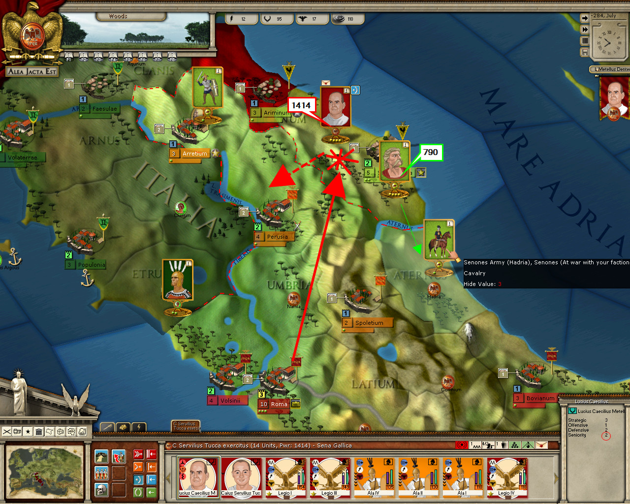 One thing that could go wrong in this plan is if Britomaris gets tricky and decides to attack Arretium from Ariminium. However, there is a steep mountain border between those two provinces, and in winter attrition will cause quite a hit. So, I don’t expect this.