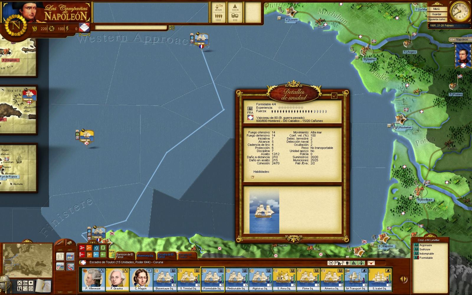 Sí, lástima que no se conozca la composisicón exacta de esa escuadra, no es la primera vez que me topo con que la IA monta una escuadra toda entera de fragatas, corbetas y otras unidades menores. En cualquier caso, hay que aprovechar para salir de La Coruña. Veremos si Villeneuve toma la decisión...