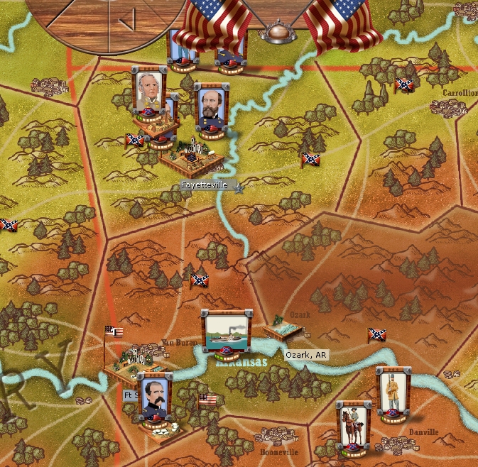 This is an early October supply situation for the area of Arkansas and Missouri. On the East you can see the 'western shore' flanking move that netted Madison and as far as Bolivar. The area supplied will change. I have ownership of the area north of the Arkansas near Madison, with the only two towns north of the river being Fayetteville and Ozark, on the far western end of the river. The situation in the west shows greater loyalty than control. Stand Waite is now active and moving. Still the entire CSA army depends on Little Rock for supply.