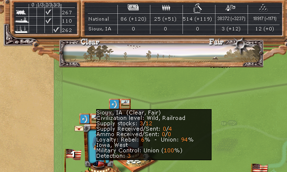 Many of the one-year militias are disbanding, leaving holes in the rear. The rear is pretty much a huge hole as it is. I'll be using the militias that are beginning to come on line to fill the depots and increase Military Control of railroads, waterways and other assets. If I have some additional militia I'll be shipping them to Kansas (west of the Missouri) and into Southern Missouri and Kentucky in an effort to build Military Control of those areas.