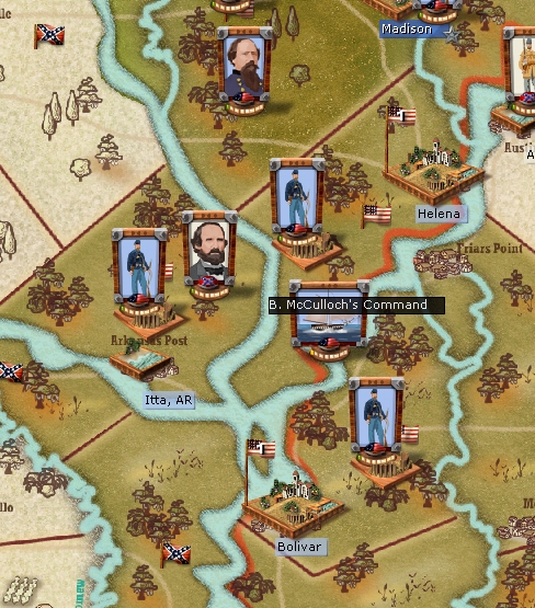 Benjamin McCullough has taken a small force, about 360 points, and pushed out my militia in Arkansas Post. I have no idea where the unit has disappeared to. There was no battle. I guess it evaporated in the swamp.