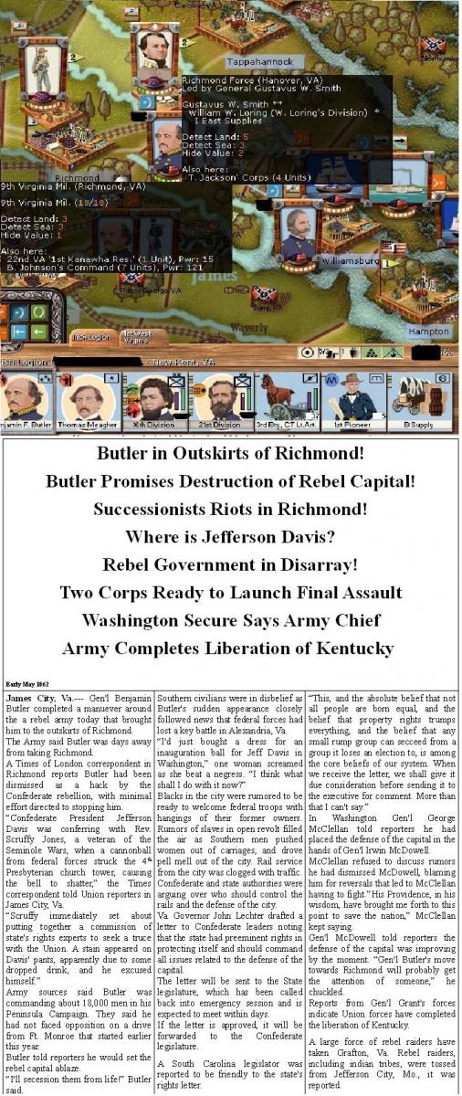 You can see some of my underused generals working the rear of the Confederate lines here. While they don't report anything in Richmond and Fredericksburg I have other sources that tell me there are strong units in both cities.