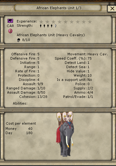 Speaking of elephants, I'm hoping they will come in handy for offence because they have a useful ability to disrupt defensive entrenchments. Also anther useful ability is apparently if they do a hit to an enemy element that element gets eliminated. Does anyone if that's right? Otherwise here are their rather unimpressive stats: