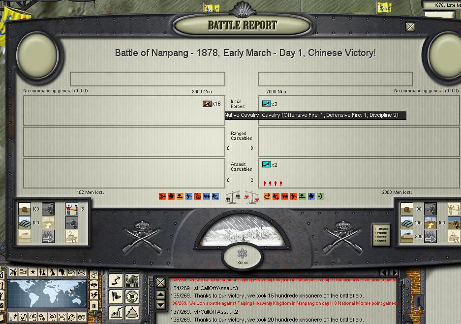I often see horses quantified in the battle reports. I assumed that horses meant cavalrymen as opposed to infantry. But I saw a battle in which my side had only cavalry, but in the battle report the only participants it had were "men" and the only losses it had were expressed in terms of "men." This could be explained away if horses meant actual animals instead of cavalrymen, and that cavalry sometimes fight dismounted. Indeed, the cavalry units in this battle did have a limited amount of firepower, 5/6 or 6/7 in offensive/defensive fire and a range of 1 when I examined the individual elements, but the mouseover seen in the battle report screen says Offensive Fire 1, Defensive Fire 1.