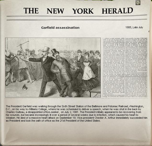 OOC - This turn of events is absolutely ludicrous. So in early June 1885, Garfield is defeated, and Cleveland is elected president. Cleveland shows up in my F1 screen. Then in early July, the "Garfield is assassinated" event fires, and Chester Arthur is now the president. So, to keep up with the changes, I have made the above work out. Anyway, I have a new president as Cleveland is now "dead". Oh well.