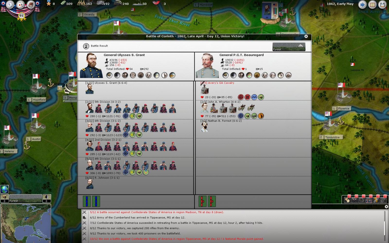 Hmmm.. It would be interesting to know why Beauregard retreated in Corinth... I mean it is quite dangerous in terms of game dynamics if that type of thing happens too often. Fort Henry, Vicksburg, and later Petersburg/Richmond situations where an army let itself be surrounded was either 1/ an egregious mistake by a dumb commanding officer (Fort Henry), or 2/ Because the place where the army got surrounded was the actual goal of the campaign with an overwhelming strategic value (Vicksburg) or 3/ Well pretty evident, the political ramifications of losing one's capital, and even there in game these are entrenched armies, not besieged ones.