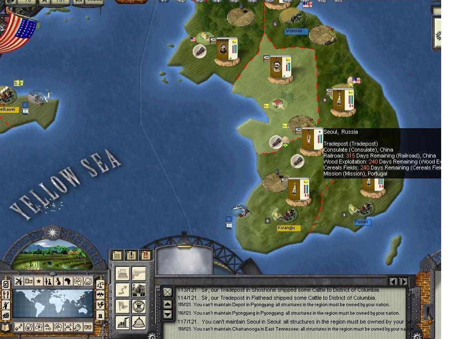 I'm willing to keep submitting turns for the USA. The problem with Korea is that maybe the provinces should be returned to Korea and not China. At the start of the game in 1850, Korea has all of its provinces except Kimchaek which flies the Chinese flag.