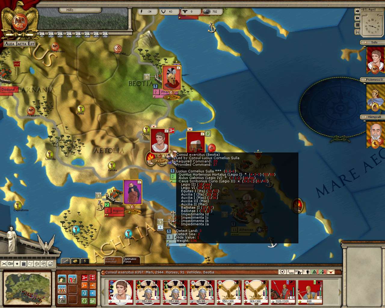 Possibly I'm doing something wrong, but I find it difficult to secure Greece as Sulla. I'm playing against Athena (Tribune difficulty with the usual moderate bonuses), and the sheer size of the Pontic armies makes it difficult to take and hold the important locations. The Ponts have three or four leaders with decent stats, and these make a habit of running around where Sulla is not. While he chases one stack, the others siege cities elsewhere. Since it's nearly impossible to completely destroy a stack, and since reinforcements are plentiful, the game devolves into three or four years of whack-a-mole in Greece while Italy smolders.