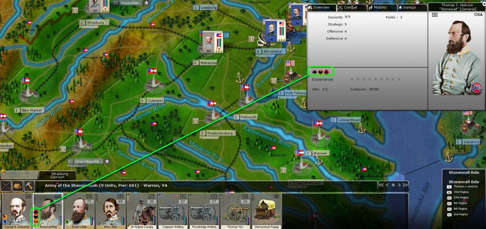 In the main campaign, click on Johnston's army and find Jackson. In the stack display at the bottom of the screen, his card shows three abilities: Surpriser, Irregular Fighter and Strong Morale.
