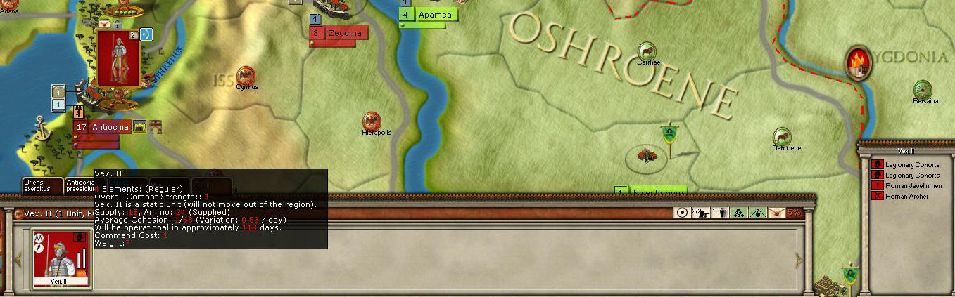 My main force at Antiochia is now at full strength and entrenched to level 4. I feel quite confident that if attacked they will hold their own.