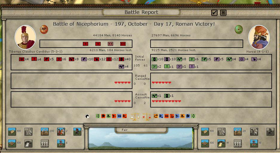 Candidus was attacked again at Nicephorium by a large Parthian force but managed to retreat to Apamea. He did manage to inflict a significant amount of damage to his attacker though. He is ordered to dig in and rest for the turn.
