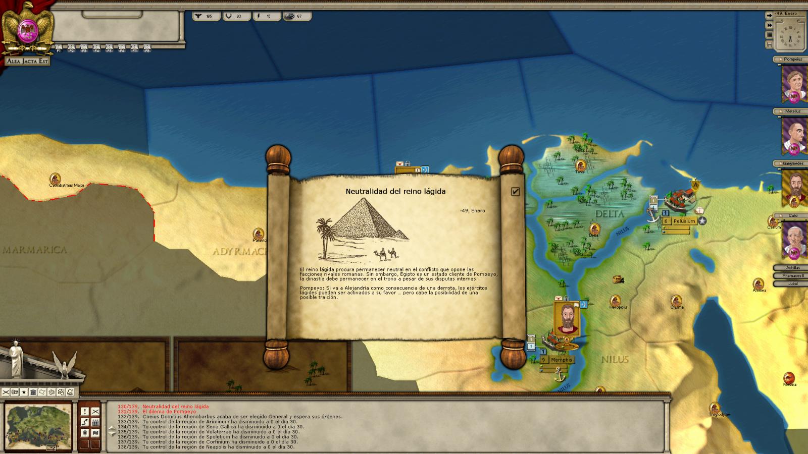 Pompeyo sabe que posiblemente pueda contar con los ejércitos de Alejandría como refuerzo, en caso de que lacosa se tuerza, pero no desea forzar la situación por el momebto ya que el recelo entre ambas facciones es mutuo y esto podría derivar en