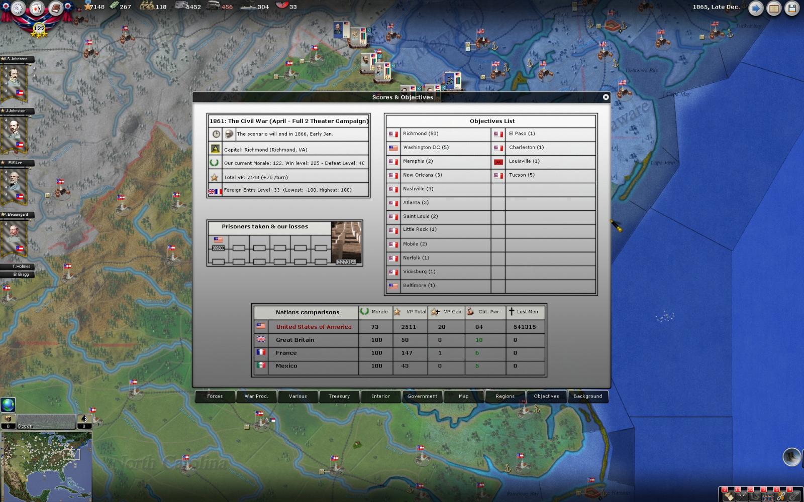 Jim-NC wrote:I think the problem is that the CSA victories have been too spread out. Unfortunately for us (as arm-chair generals), NM tends to revert towards the mean. This means that the Union's war resiliance, and CSA's war weariness have kicked in, and thus, the union is still willing to fight, and the CSA isn't ready to declare victory. If you take Washington (I assume it's still the capital), the union will lose like 50 NM, and probably surrender.