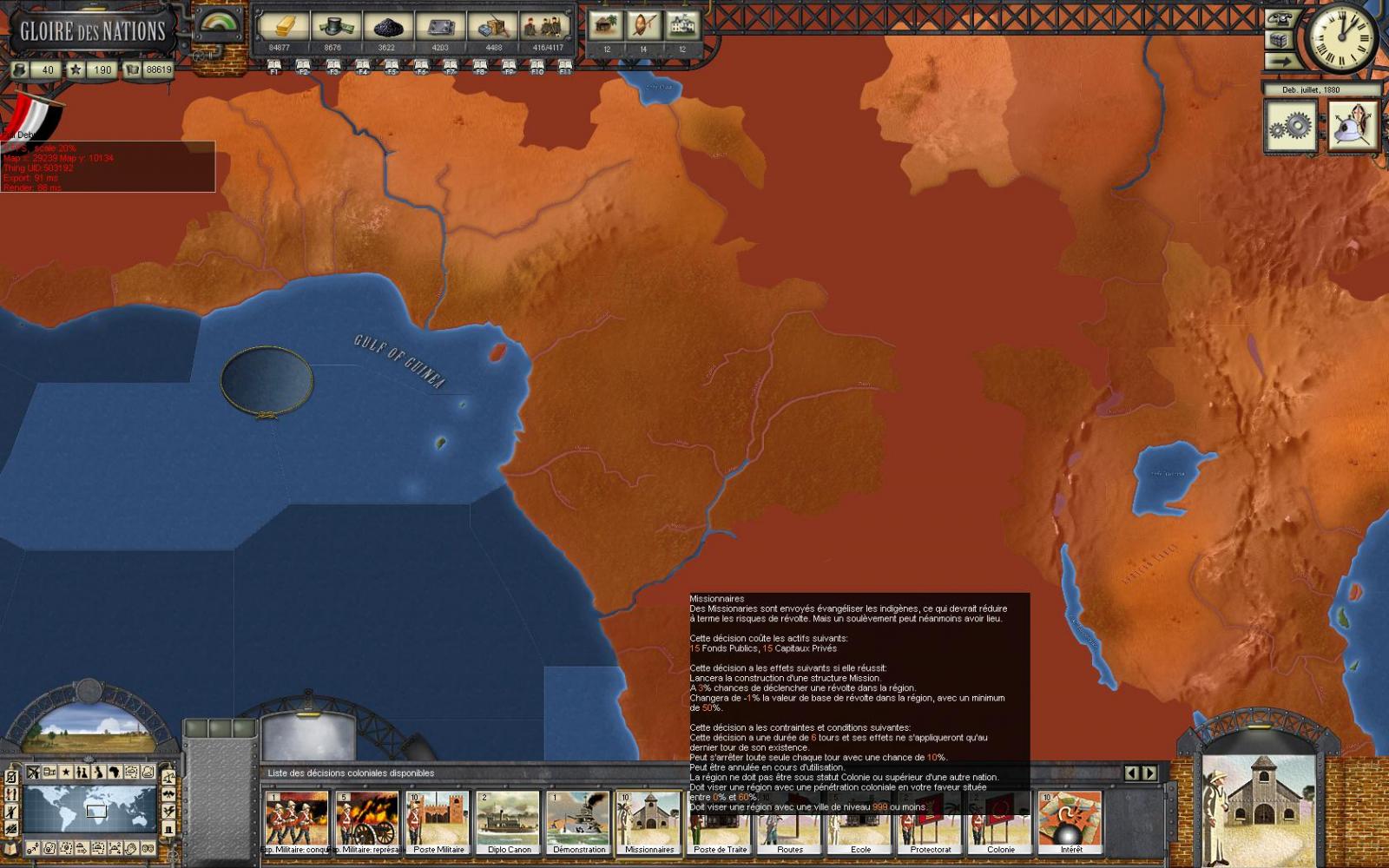 still delay of france in colonization strikes me much ! guess she too has too much to do compared to her strength, extending widely in Africa (provoking British aside) crushing Tonkin, and keeping a force almost able to hjold off prussiansd defensively is much - of course I'm Prussian, didn't help her :neener: