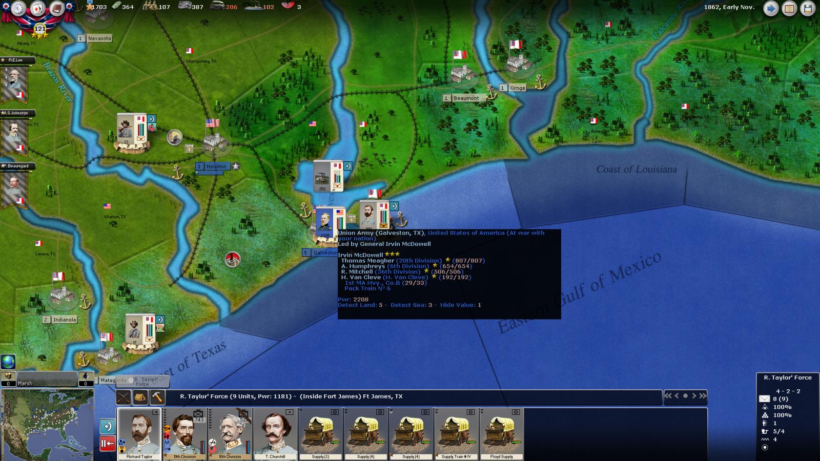 Oh ok I started the blockade of Galveston before McDowell arrived there. He was In the process of retreating from upper Texas unupplied and no cohesion. I guess once he moved into Galveston with his guns it increased the amount of ships needed for a blockade. You would think that a badly beaten army that's unsupplied, demoralized and out of ammo would have no effect on blockading ships. Oh well I'm training an Army in Louisiana to finish him once and for all.