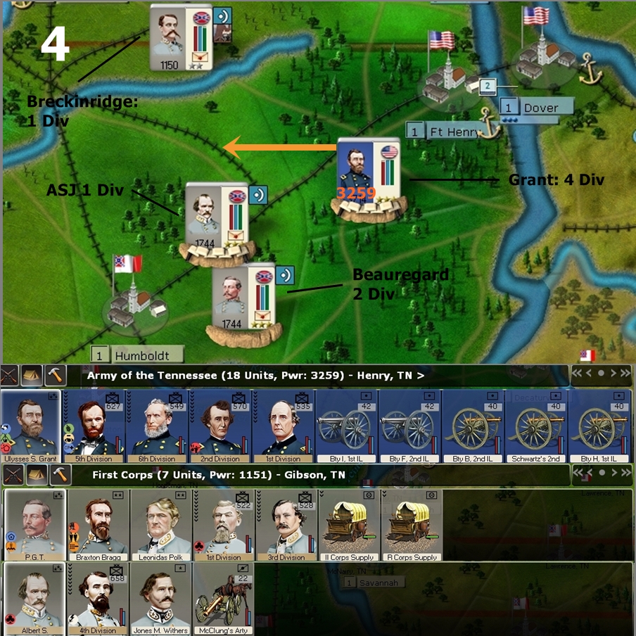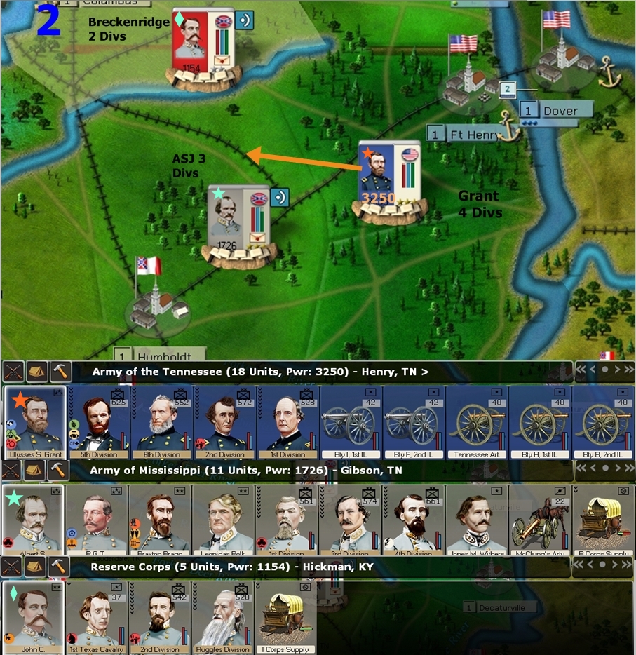 On the first round ASJ’s 2 Div Army does 75-100 damage to Grant, but takes 30-50 hits in each division. On the second round when Breckinridge and/or Bragg arrive ASJ’s divisions are weak and damaged, while the MTSGers are not. Grant targets them with his fresh divisions and there is an even combat depending on who MTSGs.
