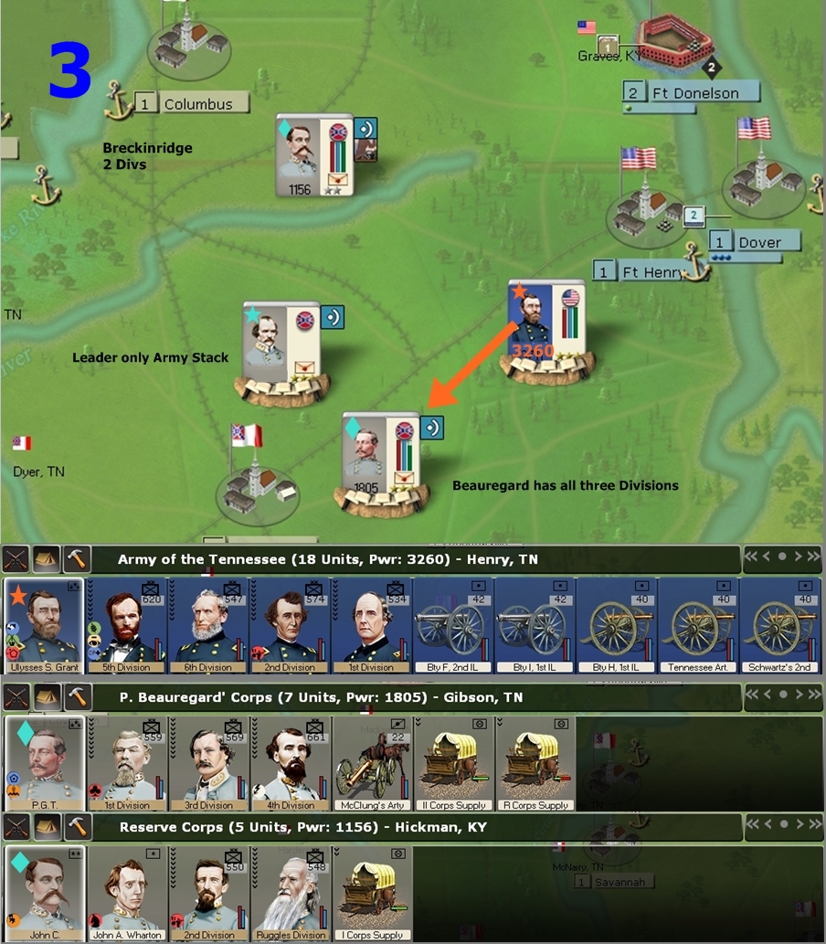 I organized Grant’s forces intentionally into a single large stack to test Army combat behavior, and sent him in as a single ~3000 PWR, 4 Division stack with 9 stack artillery (25 CPs). The Union has several more divisions available. The CSA has five potential Divisions but in all three scenarios some must MTSG to participate.