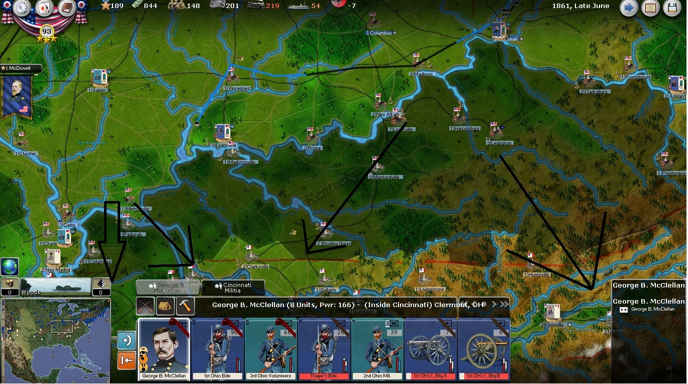 I'm the kind of guy that follows instructions and reads the manual, so as the scenario description says, I'll be looking at moving on Richmond, securing Kentucky and Missouri, and getting a blockade going.