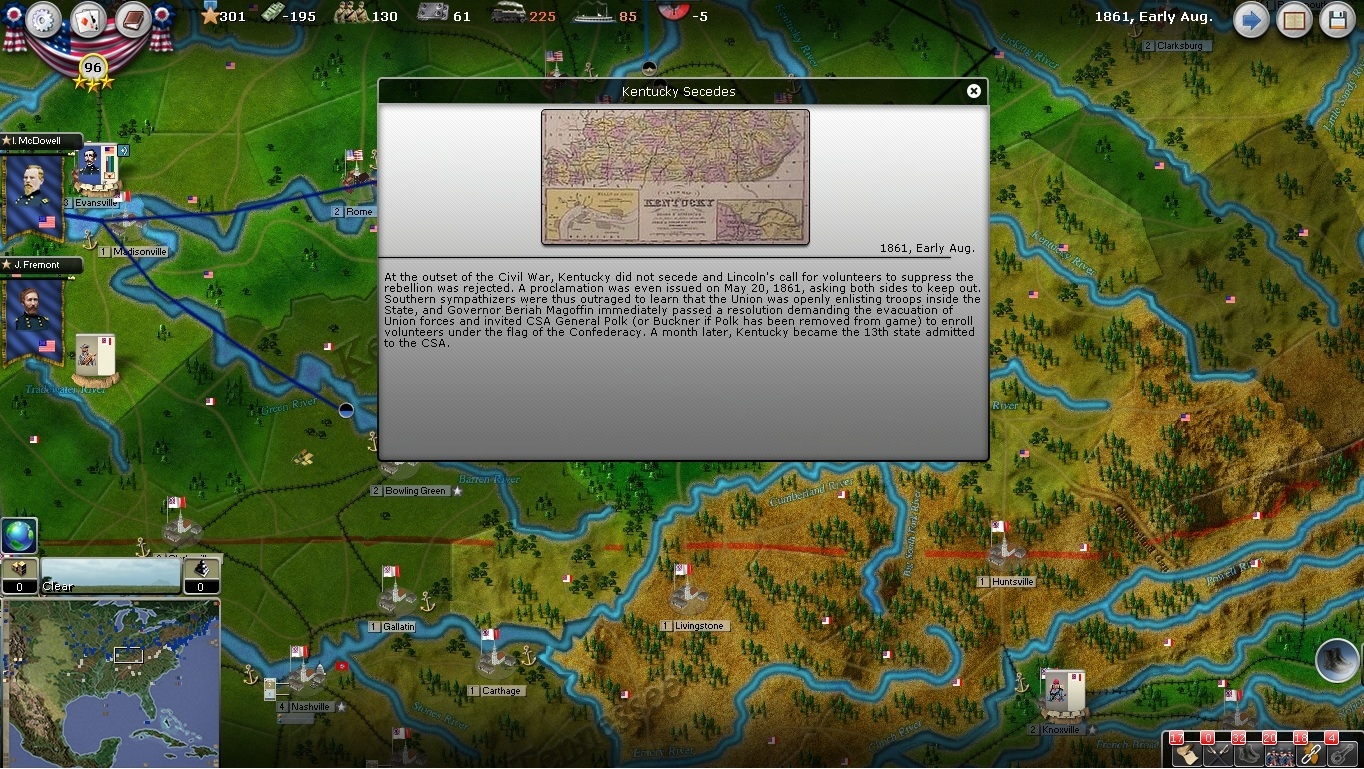 William Nelson's gambit to organize pro-union Kentuckians despite the state's official neutrality seems to have pushed the Governor of Kentucky over the edge. The state has entered into open rebellion at a moment when Union forces are still being mustered and are effectively locked in place. The fate of the war could hang on the fate of Kentucky, and I will have to scramble to secure Northern Kentucky before the Confederacy.