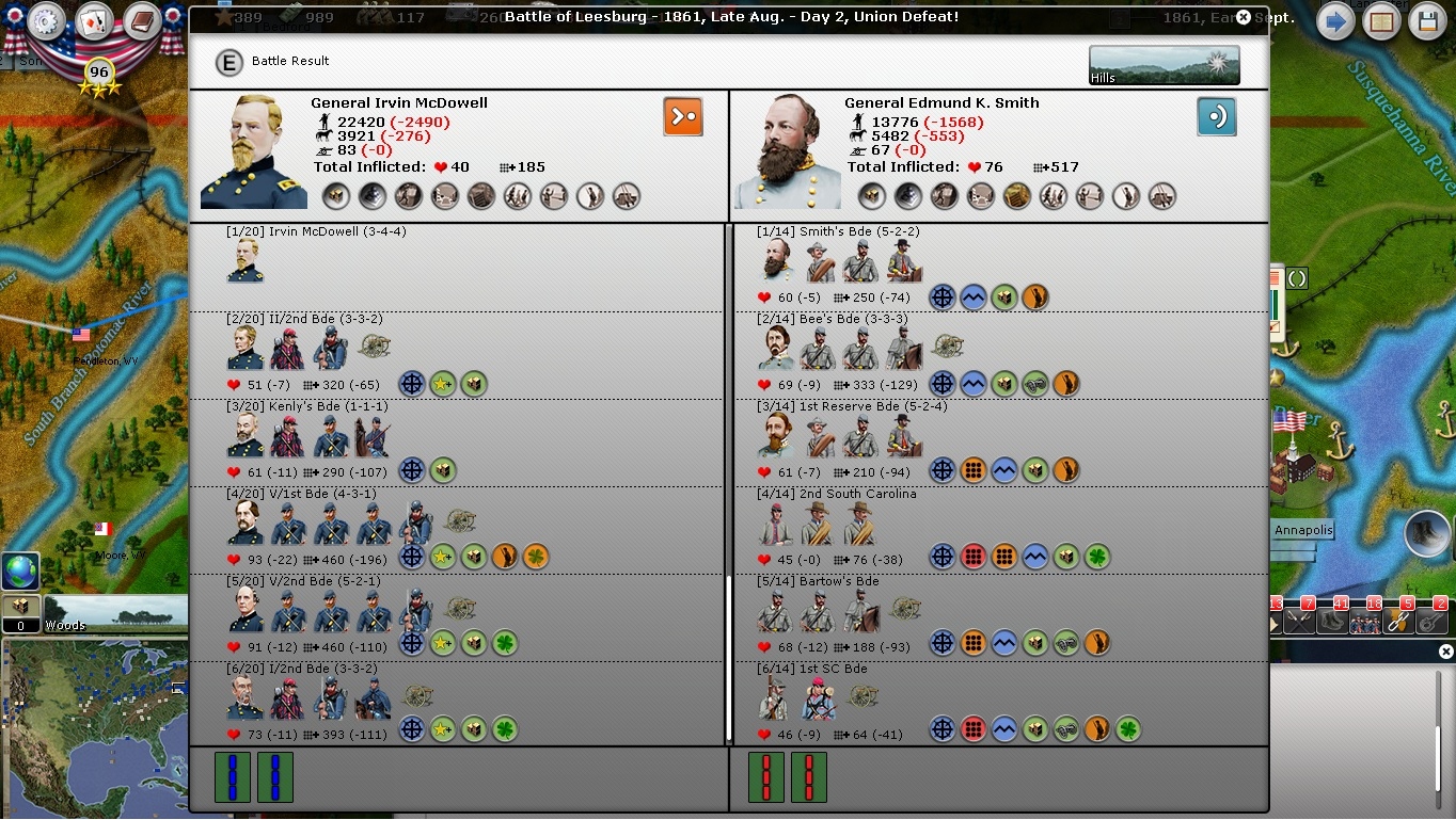 Q-Ball wrote:Good AAR, like the style. Randomized generals makes an enormous difference, particularly for the Union. Having McDowell be a 3-4-4 is pretty big, he is usable now the entire game. I also separates all the 3-1-1 generals for sure.
