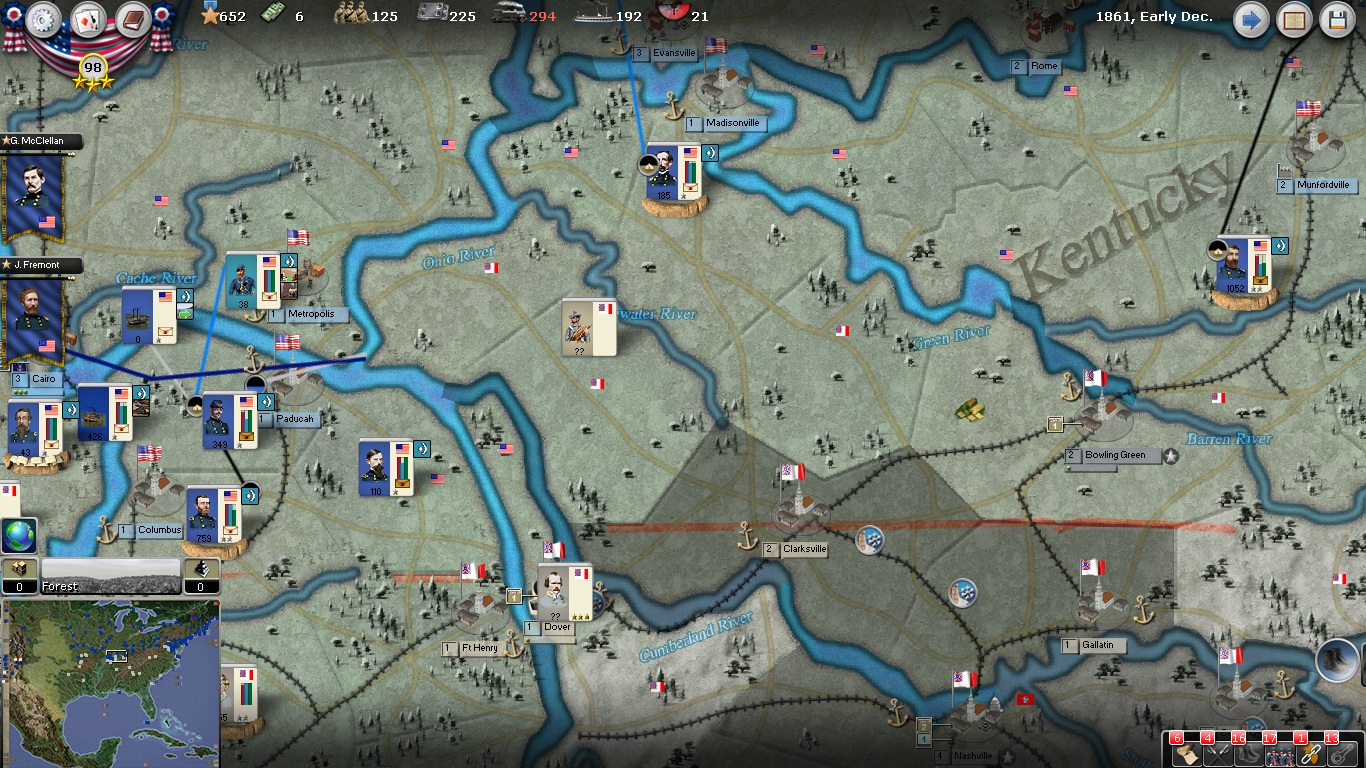 Ft. Donelson: This line of attack is designed to support the Bowling Green thrust by cutting the rail lines across the Cumberland and Tennessee Rivers and using my riverboats to trap any forces north of the Tennessee. The main problem is that to achieve the necessary surprise, an amphibious assault on the Dover region is probably necessary and could be defeated by a moderately large defense force.