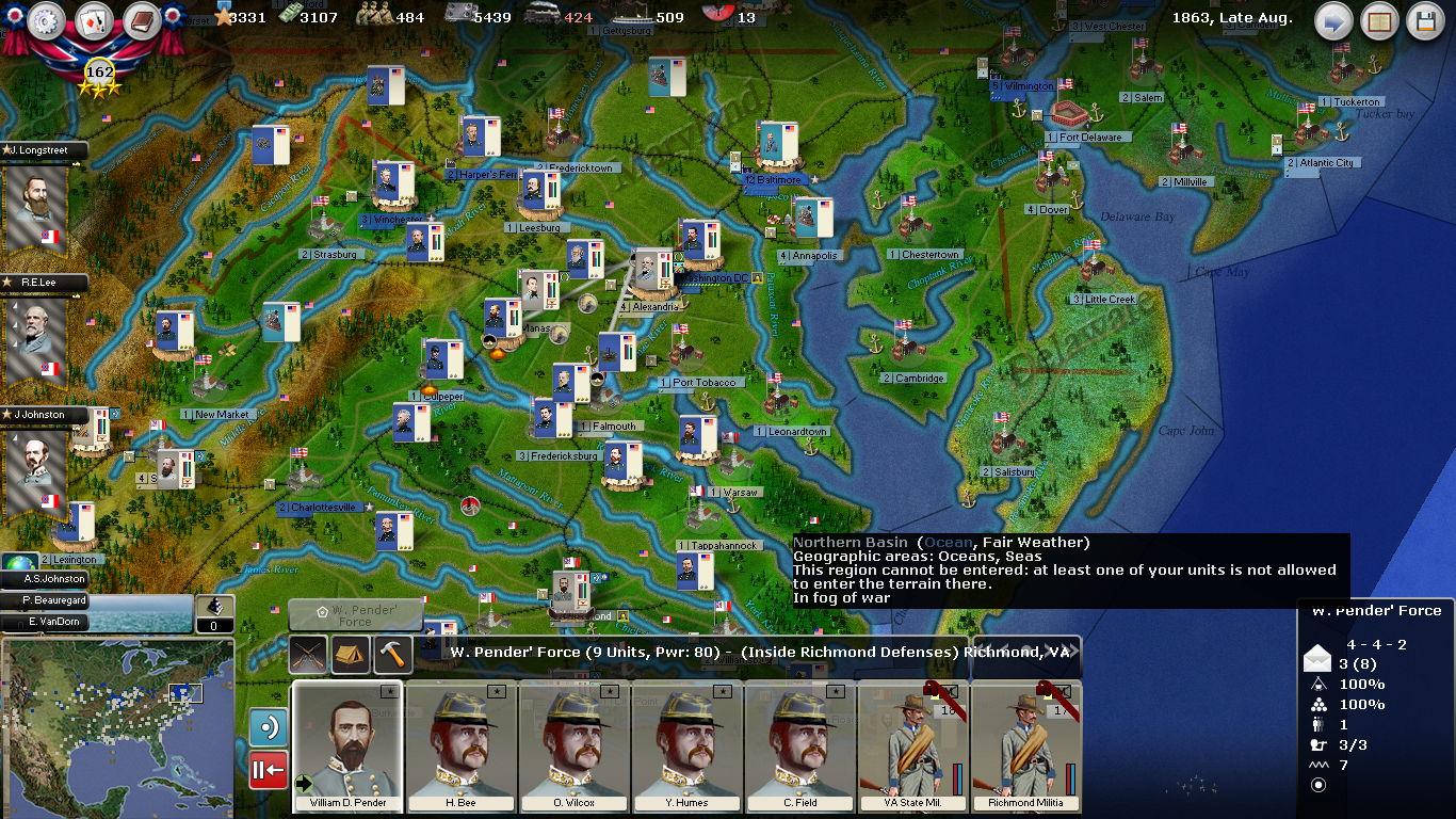 As an update, my western advances have gone great, but I've collapsed in the east. I won or stalemated battles in Manassas and Falmouth but the larger union force was able to cross the Rapahannock. I had a fighting army under Longstreet defending Richmond, which I sent to Fredricksburg to push back an equal sized force which I believed must have cohesion difficulties. I was wrong. My first turn the battle was a stalemate, and I thought I would finish him off in the next turn. Instead I lost and was sent across the Rapahannoc, retreating to Falmouth(?!). I tried to cross back, lost, and the union sent a couple more corps from the Shenandoah Valley (did I mention I lost it), and now has 60,000+ in Fredricksburg, not including smaller corps in neighboring counties. In the turn you are seeing, two corps and two armies in Falmouth, Alexandira, and or Manassas have all just lost at least one battle and are crippled. I don't see an escape, and if/when Richmond falls, there isn't much left in the Deep South to stand up to the marching Union army (Charlston Defense has been finishing off routing Union troops, but is only 8000 strong, another similar sized force just cleaned up the York Peninsula and is exhausted but existing in Fort Monroe, and a third "protects" the base of the valley in Stanton and Covington.[ATTACH]27007[/ATTACH]