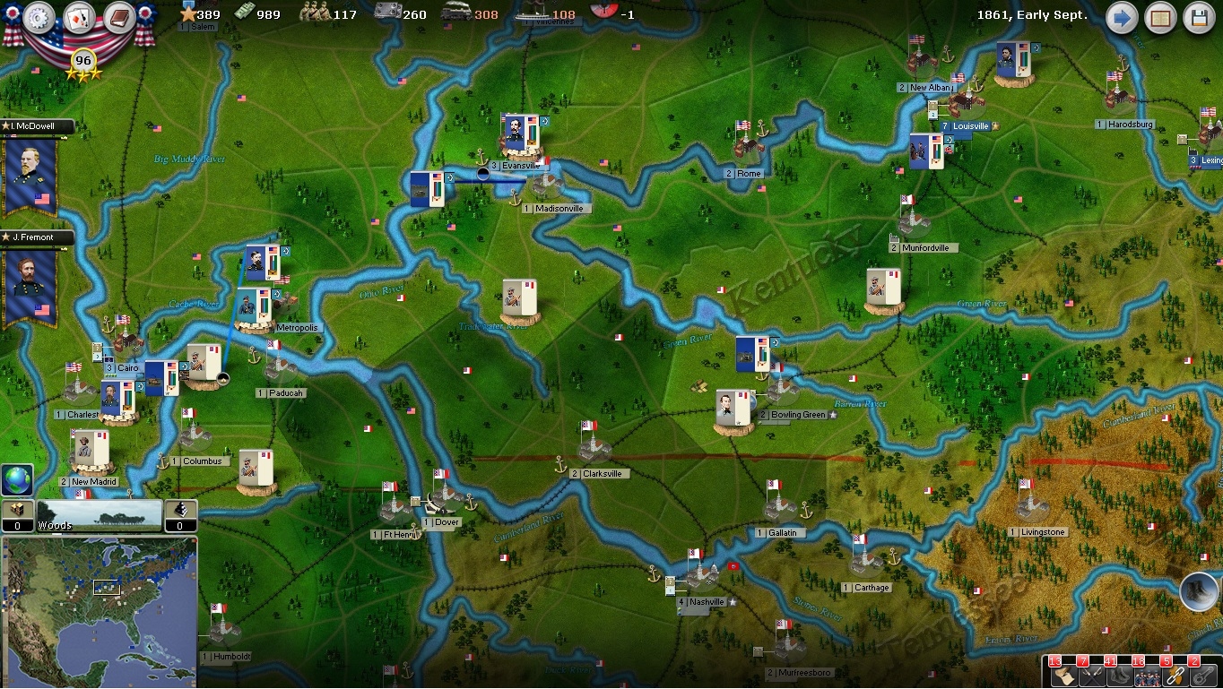 By early September, the situation in Kentucky seems to have stabilized. Louisville is held in force and a small river fleet is attempting to block railroad communications to Munfordville. I won't really feel secure though until Munfordville is taken and I can create a line behind the Green River. In Western Kentucky, General Wallace as been ordered to secure Paducah to prevent the rebels form placing guns on the Ohio River. A real offensive won't be possible until at least December, but if I can grab advanced jump off positions, I will.