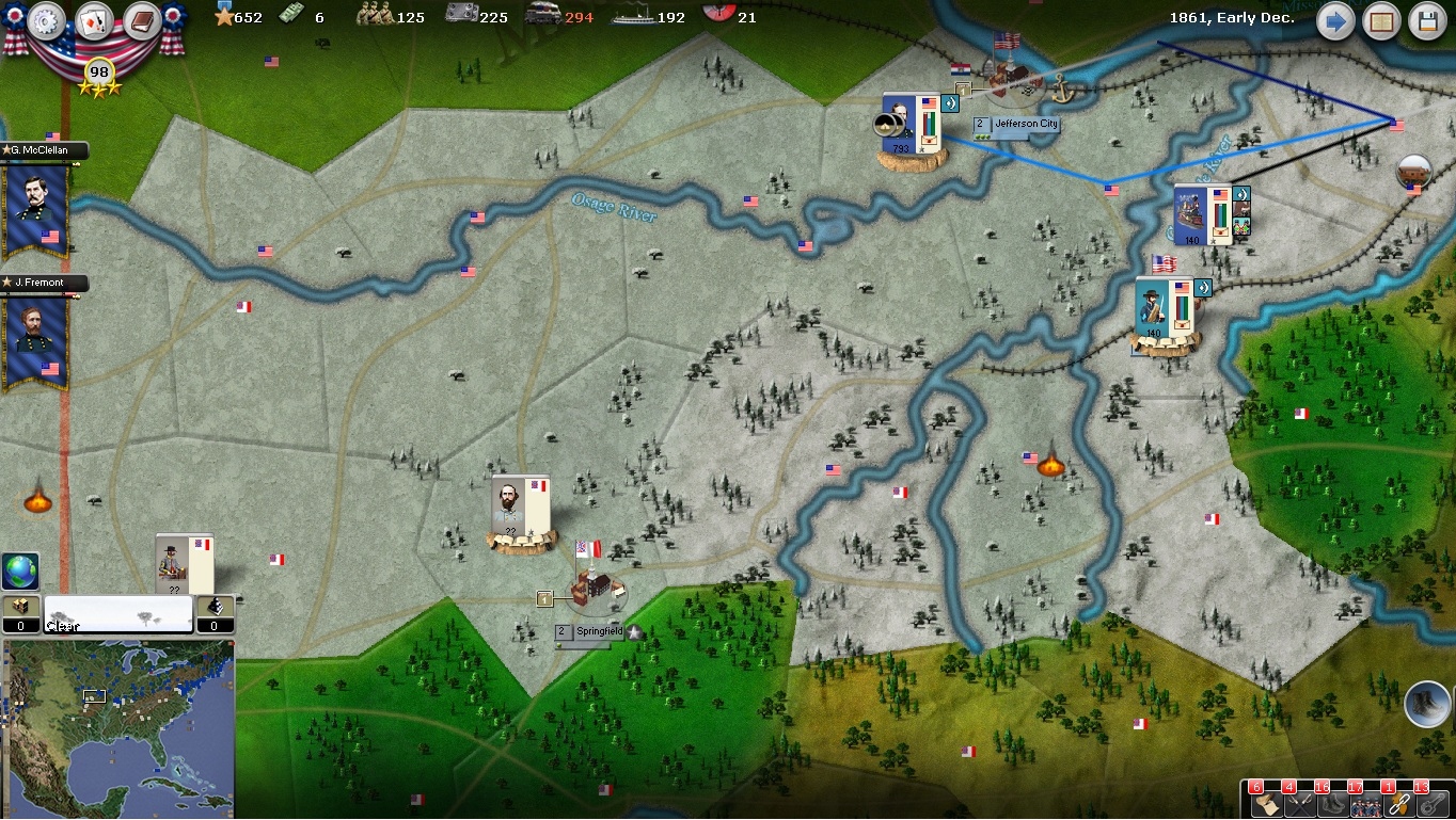 The war got started early in Missouri and I find myself in a footrace. General Lyon did the nation great service by capturing Rolla BEFORE the depot could be destroyed. At the same time, Mo militia have been dispatched by steamboat to Jeff City. Even more surprising, the 2nd cav has discovered that Springfield is unoccupied, with Stearling Price down in Fayetteville. My horsemen are being sent to secure the place while Lyon races to re-enforce them. Of course with my boys so strung out, there is a danger that Price will strike them down in detail.... All eyes are on Springfield...