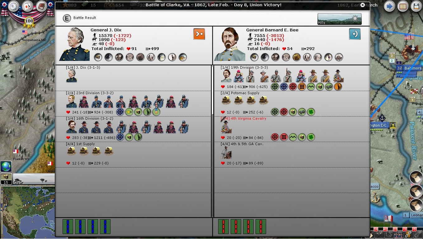 The Vally Army represents a wildcard. Patterson is as bad as his un-randomised self. Harper's Ferry is little more than a blocking force. If the rebs push hard, I may be forced to refocus my plans on repelling them.