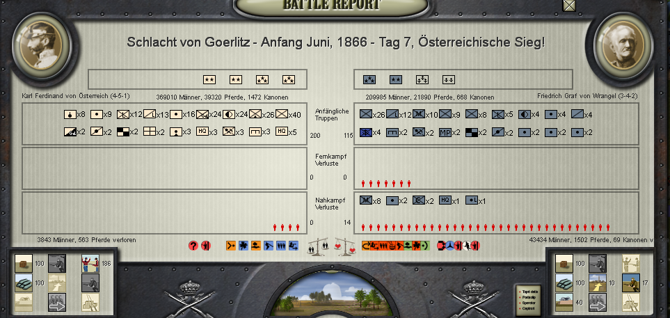 Thanks for the info! And this report slipped my attention, obviously. What Karl got for his "disagreement" is a nice command of 12 regiments in the North African steppes and deserts, I hope he enjoys it. Thanks also for the hint with the F10 and -25 relations, I just didn't know that. AGEOD games are whole worlds of mysteries to be discovered one by one :)