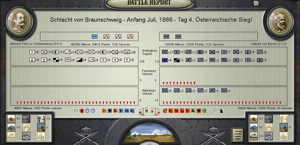 Karl von Preußen has taken command of Luitpold's army, but to no avail. It was decisively beaten by Schwarzenberg and Ramming at Magdeburg and ran off in retreat into Saxony - where it was joined soon by Wrangel's army which had to cede the Berlin area to Archduke Karl Ferdinand. Breslau surrendered, so Gablenz will have the honor to lead the final assault on the Prussian armies with the poplace of Dresden watching.