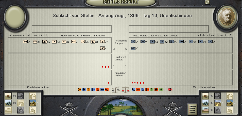 Newly promoted, Franz Freiherr von John is sent to take command of the battered army and lead it from the field to well deserved rest and refit in Rostock, which has to be taken by them first, though. Gablenz is on his way to Berlin where he is to assume command of Schwarzenberg's army, while the army he lead to the great victory of Dresden may now spend a few summer weeks in pleasant Bohemia, with Pilsner beer on the Emperor's expenses and the adoration of Prague's young ladies. Archduke Karl Ferdinand sets out to Stettin to wash away the stains on the Imperial army's reputation with Prussian blood.