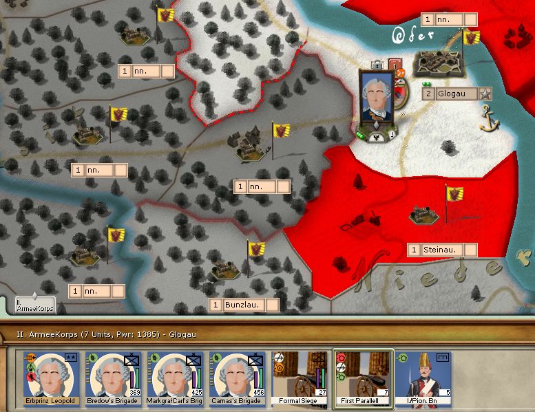 On a positive note, I've found awesome new sound-samples for battles and I've managed to create my first event (apart from blocking Saxony)! The Oder-segment at Glogau only gets unblocked once the Prussians take Glogau (then their supply-flotilles can set off*). I've first tried to make the fortguns bombard the bateaux, but for some reason it doesn't work (you always hear the bombardement-sound, but no hits are inflicted). Also implementing a fixed warship ("Oder Blockade") didn't really work. :D However, for operations in Lower Silesia, the Oder-segment at Breslau is more important because of its length in the game-map - and Breslau itself is hard to model. Basically, the city opened its doors to the Prussians without any resistance.