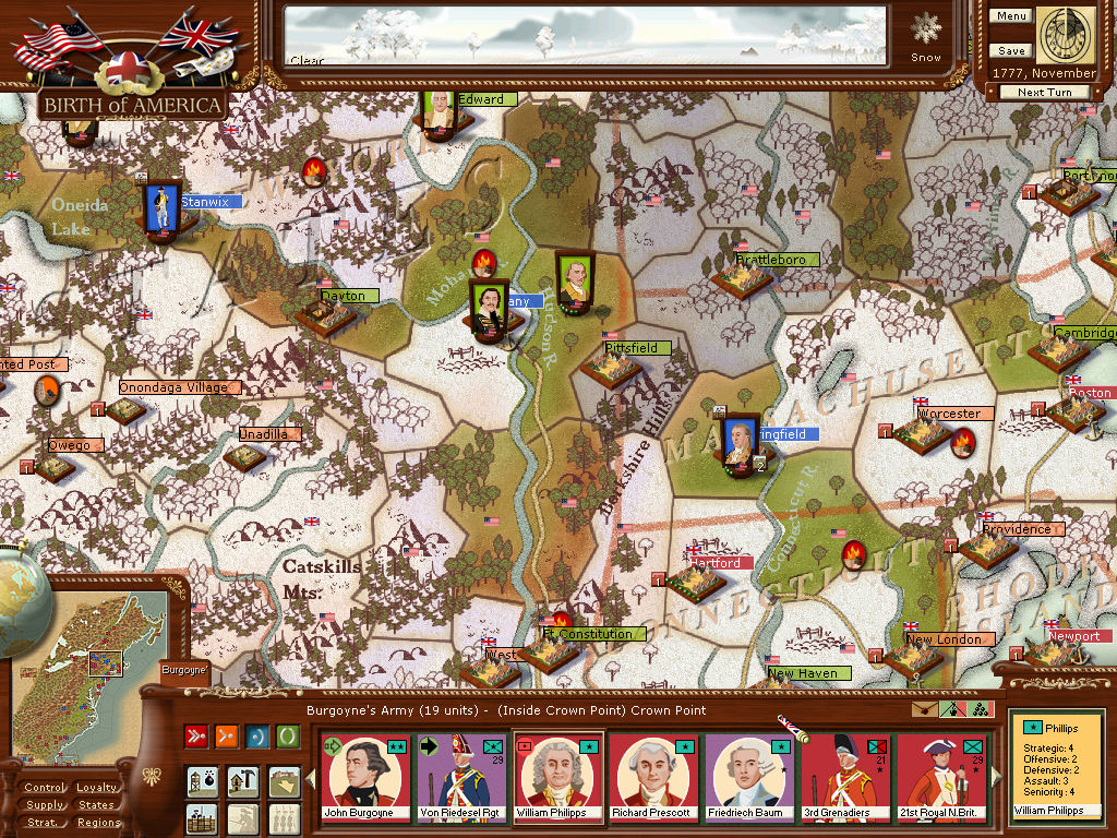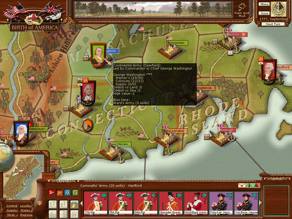 Cornwallis is still besieging Hartford - the defenders' supply level is zero. Lee and about 6 units are trapped in there.