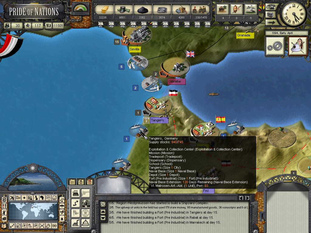 Finally we have finished the naval base and fort at Tangiers, this will allow us to controll the entry to the Mediterranean sea and it's close enough to Gibraltar to allow us to invade the british enclave more easily.