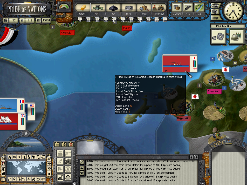 We were able to mediate a cease fire between Russia and China, negotiations are under way. On the other hand Japan continues its agression against the chinese, they're blockading most chinese ports and are sending more troops to Korea, this of course doesn't please the russians and the tension is rising there, I fear we maybe won't be able to prevent a new conflict in the region from erupt, but as a security measure we have sent a squadron of torpedo boats and a Marine division to our naval base in Guam.
