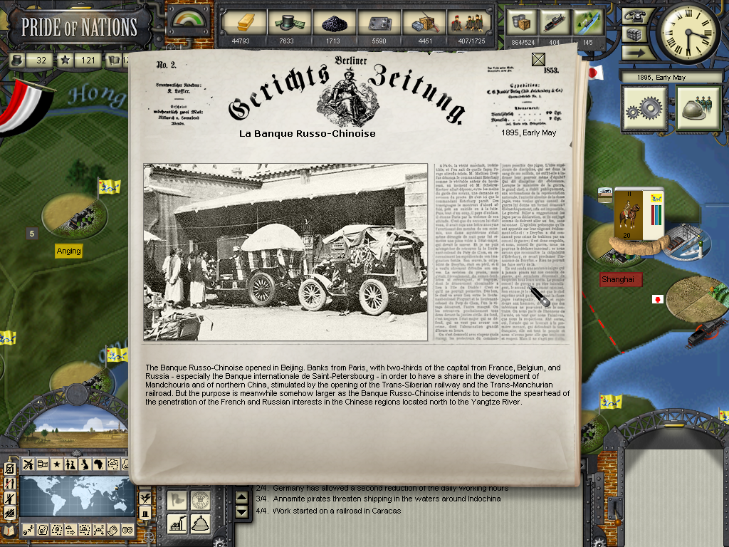 We were able to mediate a cease fire between Russia and China, negotiations are under way. On the other hand Japan continues its agression against the chinese, they're blockading most chinese ports and are sending more troops to Korea, this of course doesn't please the russians and the tension is rising there, I fear we maybe won't be able to prevent a new conflict in the region from erupt, but as a security measure we have sent a squadron of torpedo boats and a Marine division to our naval base in Guam.