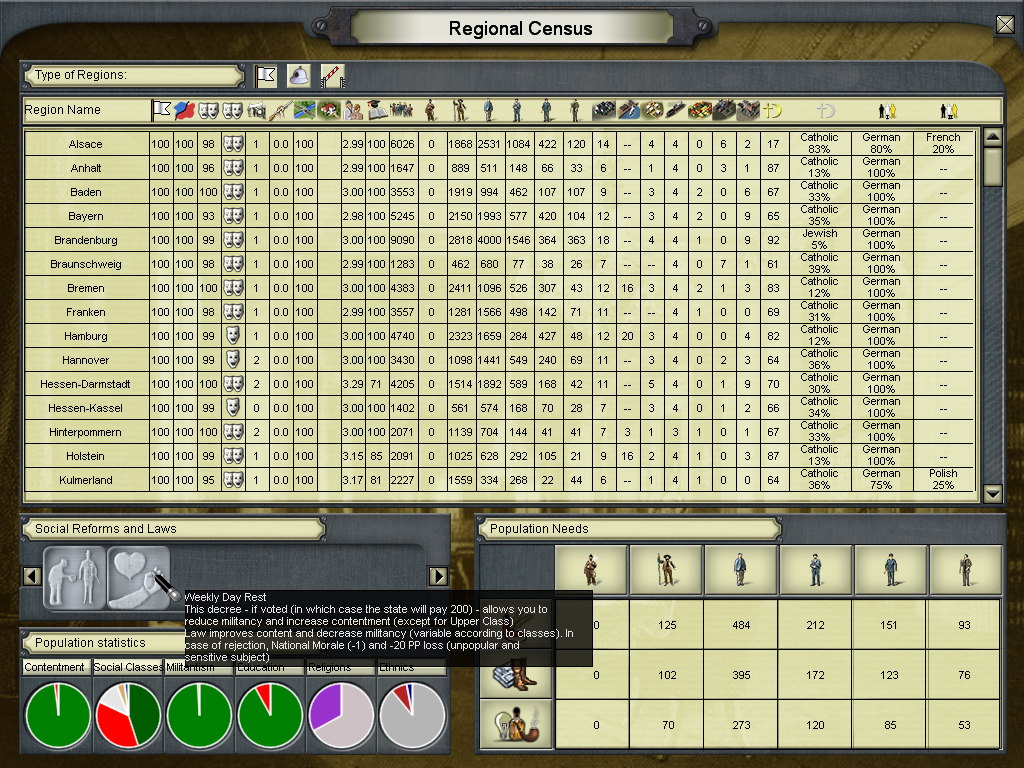 The russians are getting more bellicose with every passing moment, every now and then they're getting into conflict with another country when not straightforwardly declaring war, as was the case with China, it's seems that my cousin Nicky doesn't feel any kind of constraint when it comes to achieve Russia's goal, no matter the cost it might take, specially now that Russia is allied to France (as a player I'm not sure if this behavior was engouraged by the script I made to establish a deffensive pact with France, but if it is the case, it's a very realistical posture for the AI to take). So to defend the german people and their interests I therefore feel it's my duty to let our Empire prepared for war.